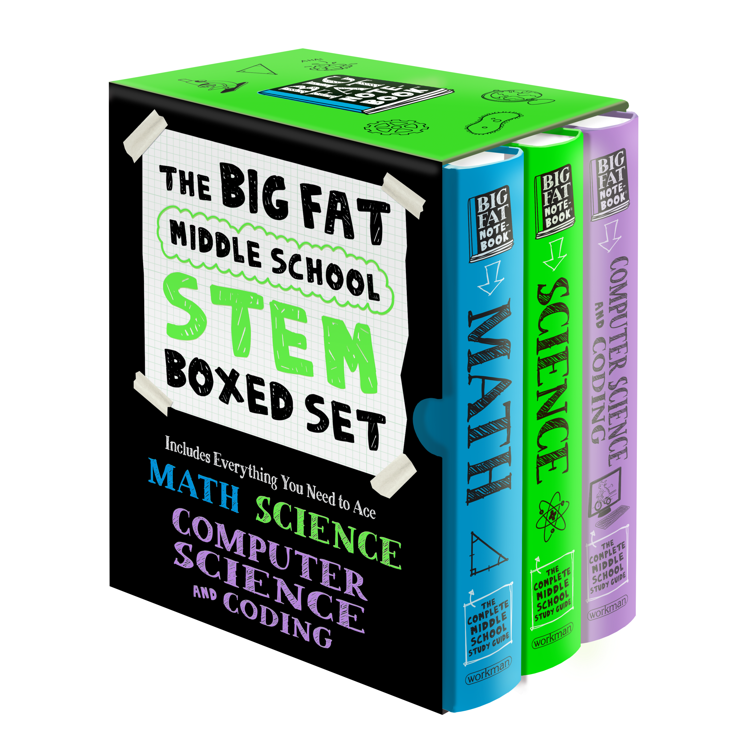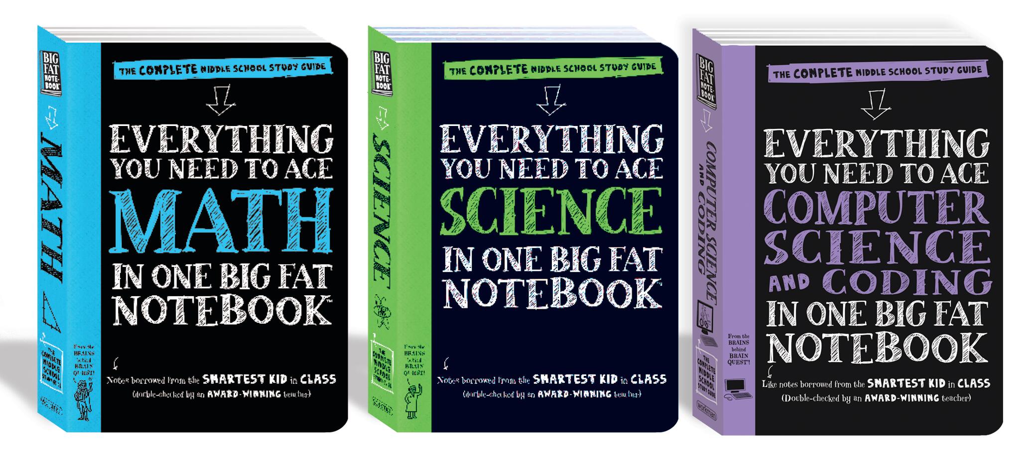 Perfect for homework help, study sessions, or when your textbook just doesn’t make any sense, this bundle of Big Fat Notebooks is the one-stop-shop for middle school STEM study guides. Together, these three bestselling books cover all the important STEM concepts middle schoolers need to know—from the Pythagorean Theorem to exponents, atoms to outer space, and binary code to Boolean expressions.